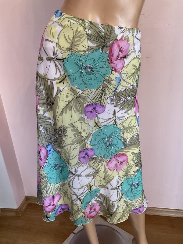 Розширена. Дуже гарно лежить. В талії- резинка. На підкладці. Без дефектів. Заміри в талії 42-44 см в бедрах 62 см довжина 68 см 2:3:24