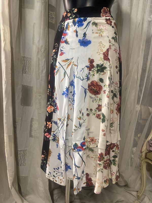 Стильна яскрава спідниця міді від Maje. Склад:віскоза-100/. По талії вставки гумки, застібка-блискавка по спинці. Спереду і сзаду по три зустрічні складки. Розмір по бірці-1. Заміри:довжина-78 см, ПОТ-32 см, ПОБ-40 см. Супер!