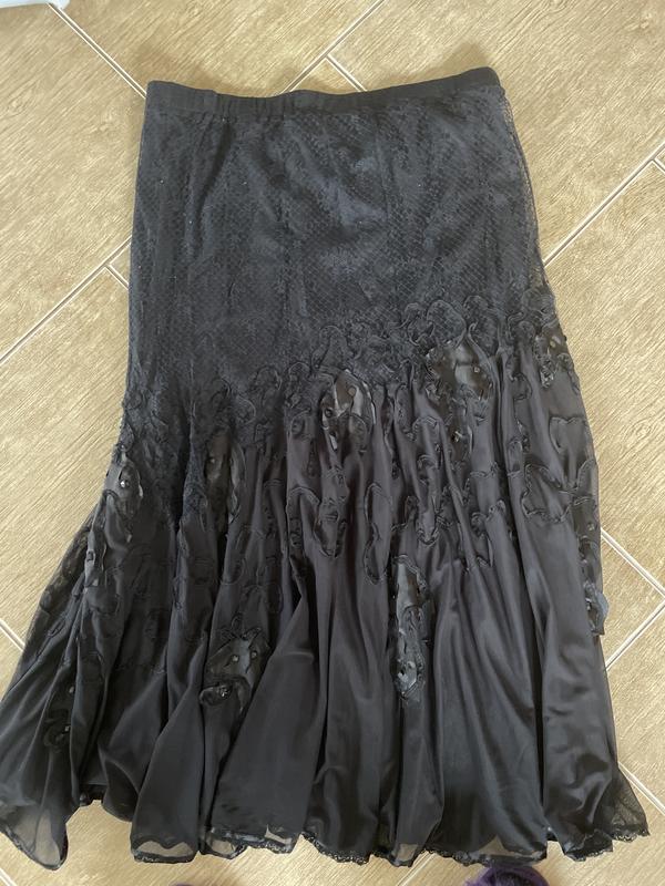 Длина 103,талия 50а спокойном состоянии, на резинке, поб66.комбинированная кружево и шифон по низу, украшенная камушками, трикотаж не мнется