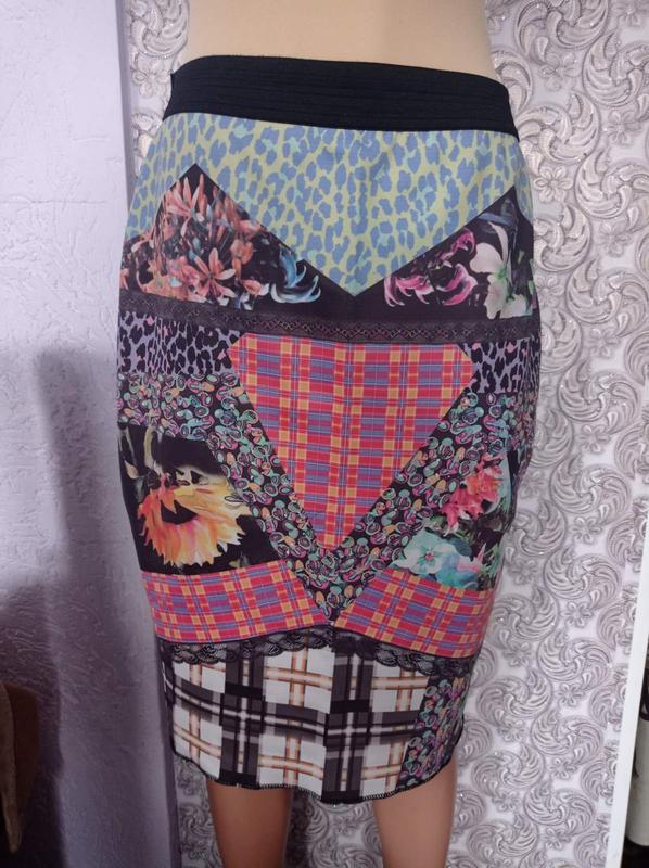 Юбка интересного принта,на поясе -резинка.Теань тянется. Размер указан L. Состояние идеальное. Состав:95%полиэстер,5%эластан. Замеры:ПОТ-36см(резинка),ПОБ-47см, Пониза -41см, длина -57см. Фото на теле нет. Пересылка.