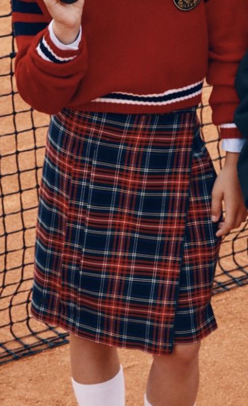 Юбка в клетку и сзади в складку, на запах, можно регулировать ширину талии, застежка пуговицы
