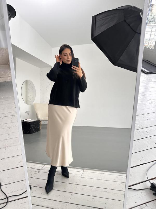 Юбка женская миди, шелковая, шёлк-сатин, батал, большие размеры, однотонная, бежевая