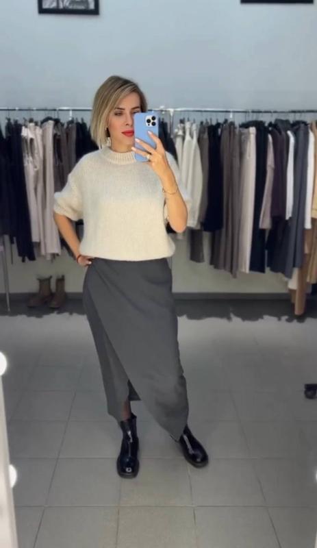 💎Юбка Модель 126 Цена: 1000грн Размер: 48-50, 52-54, 56-58 Ткань: костюмка барби Цвет: черный, графит. Стильная юбка длины миди на запах. С боку застежка, втачной пояс, высокая посадка. Изделие декорировано запахом с клинообразным вырезом. ⭐️Замеры: 🖇48-50 Талия 82 см Бедра 111 см (растяжимость 2-3 см) Длина 87 см 🖇52-54 Талия 90 см Стегна 120 см (растяжимость 2-3 см) Длина 87 см 🖇56-58 Талия 100 см Стегна 128 см (растяжимость 2-3 см) Длина 87 см