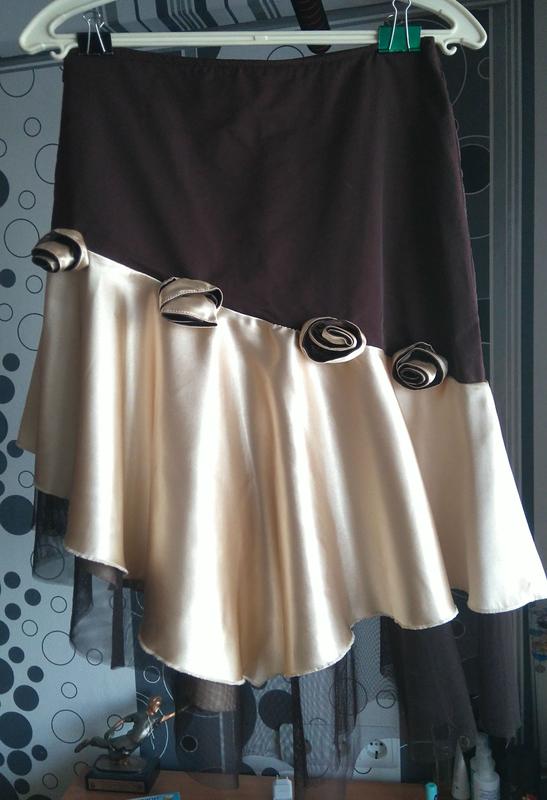 Юбка нарядная. Размер 48. Верх из плащевой ткани, низ - атласный. Розочки пришиты по всему объему. Длина - 75 см, объем талии - 76 см, объем бедер - 96 см. Носилась мало.