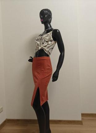 Спідниця-олівець з еко-замші, дуже м'яка до тіла. Тканина трішки тягнеться, гарно сідає по фігурі. Колір теракота. Сексуальний розріз. Стан нової, жодного разу не вдягнена. Заміри: 🔸пояс 33 🔸стегна 42 🔸 довжина 61 🔸 висота розрізу 24
