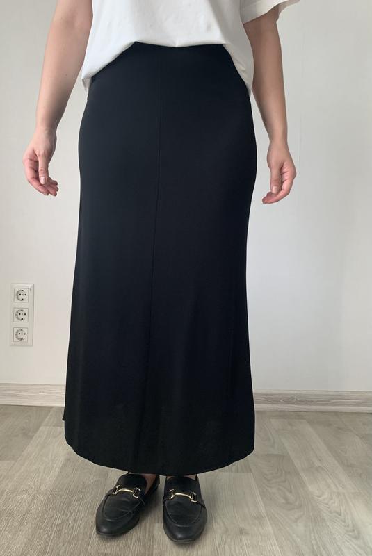 Спідниця довжини міді, чорного кольору Розмір 40(маломірить!) У складі 97% віскоза, 3% еластан Заміри: Довжина 95 см, напівобхват талії 35 см Стан ідеал