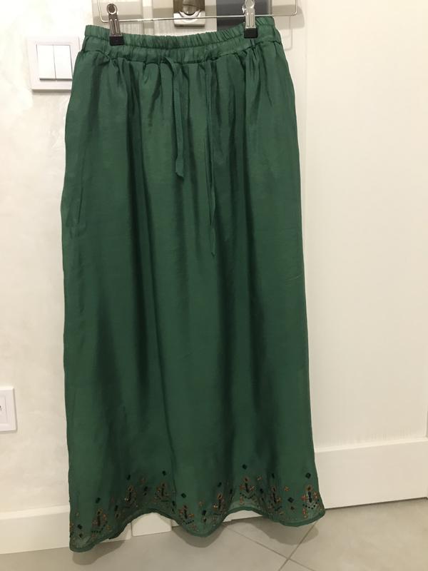 Зеленая летняя юбка на подкладке. По талии на резинке. Цвет травяной. Нова. Снизу вышивка.сбоку карманы, на завязке. Подходит на размеры от S до Xl.