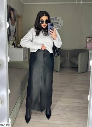 Спідниця KD-1136 Мод. 214 Розмiри: 48-52, 54-58 Трендова спідниця Спідниця довжини міді з еко-шкіри чорного кольору. Модель з розрізом спереду і високою посадкою!! Застібається на блискавку і гудзик. Сміливість і елегантність в одному образі!!! Пояс окремо чорний + 100 грн Тканина: еко шкіра на трикотажі Замір: 48-52 ОТ 84 до 86 см У 108 плюс тягнеться Довжина 100 м 54-58 ОТ 92 до 94 см В 116 плюс тягнеться