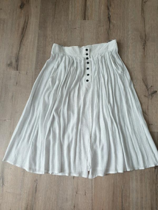 Полупрозрачная легкая белая юбка, в черную точку, застежка пуговицы спереди, бренда и состав ткани нет, ткань жатка, есть 2 кармана, талия не тянется, ПОТ 44, длина 80 см, на широкие бёдра, после стирки можно не гладить. сток