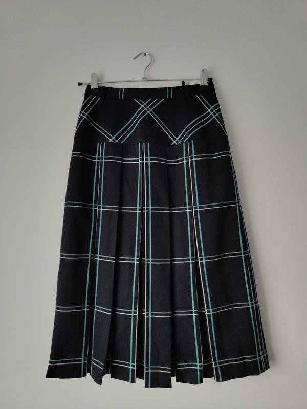 Юбка на подкладке темно синего цвета в голубую мятную и белую полоску, высокая талия, застегивается сзади на замочек и пуговицу. Замеры: ПОТ - 33 не тянется чуть ниже пояса полуобхват 42 бежевое свободное длина 72