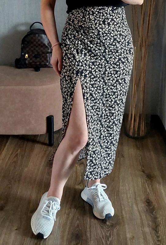 Стильная юбка из натуральной ткани (вискоза) в цветочный принт. Застегивается на скрытую молнию. Разрез сбоку. Очень универсальная вещь, можно носить в любое время года. Размер XS ПОТ - 35 см ПОБ - 47 см Длина - 85 см Глубина разреза от низа изделия - 45 см