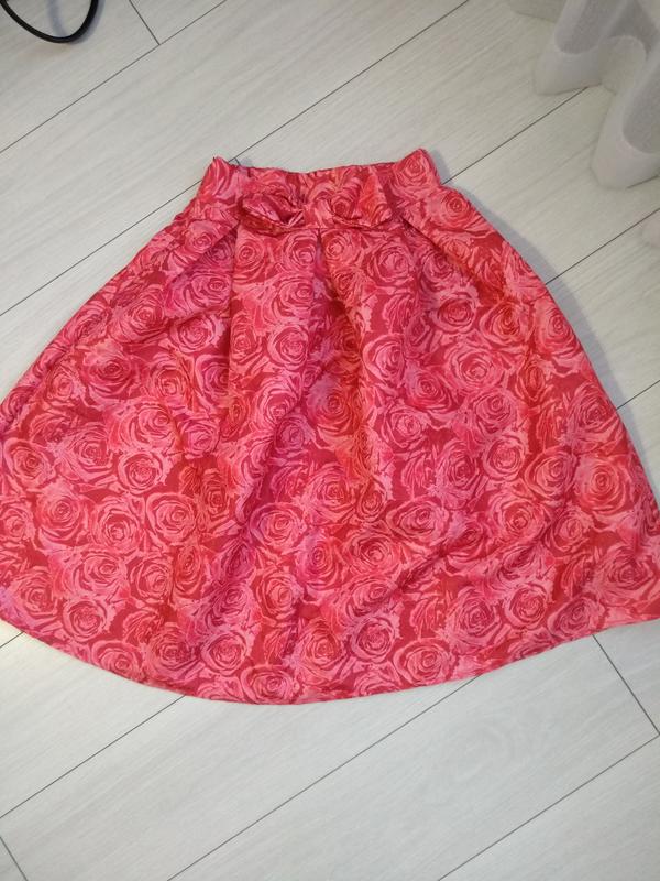 юбка пышная объемная фасон солнце клеш верх ткань плотная хорошо держит форму сбоку застегивается на замочек длина 73 см полуобъем в талии 35 см имеет резинку тянется до 39 см спереди украшена бантом юбка новая но без бумажных бирок
