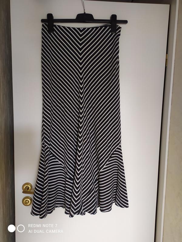в ідеальному стані, тканина віскоза, не дуже мнеться. завдяки покрою і поломкам, гарно моделює фігуру і дуже стильно виглядає. а чорно біла смужка завжди буде в тренді! незначний нюанс на останньому фото. довжина 88 по поясу 38 по стегнах 55 -65( тягнеться за рахунок кроя).