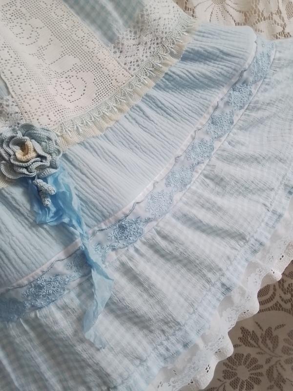 Для створення спідниці у стилі бохо було використано три вида тканини натурального складу: бавовна жата, бавовна розріджена та лляна. Зв'язане з тонких ніток філейне мереживо додатково підкреслює стиль бохо. В спідниці використане декілька видів фабричного мережива, як сучасного, так і бавовняного вибитого мережива 70х років. Також для підтримки стилю бохо зв'язана брошка, яку можна переміщати в інше місце, наприклад, на кофточку, зв'язана з ниток такого ж кольору, що і спідниця. Модель спідниці на широкій резинці, тому підійде майже на любий розмір.