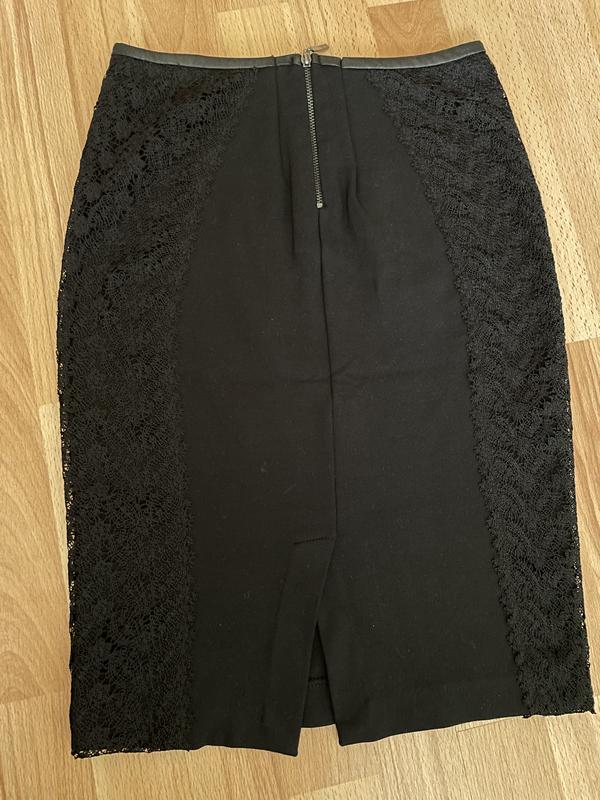 Трикотажна насичено чорна спідниця від Зара , прикрашена на боках мереживом поверх трикотажу , позаду є змійка і невеличеюкий розріз, заміри на фото в спокійному стані, тканина плотний трикотаж, тягнеться, підійде від xs до м