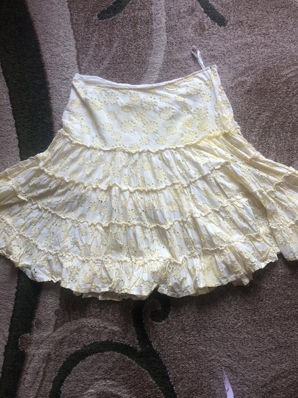 Красивая летняя юбка, нежно желтого цвета на подкладке.Обхват талии +-80см, можна носить заниженно,бедеро свободного кроя, длина 53 см.