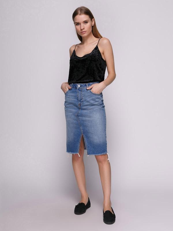 Стильна спідниця джинс з розрізом спереду Довжина міді Висока посадка Є кишені Стан Нова є пломба від бірки Заміри П.о.т-38 П.о.б-48 Довжина-56 Розріз-18