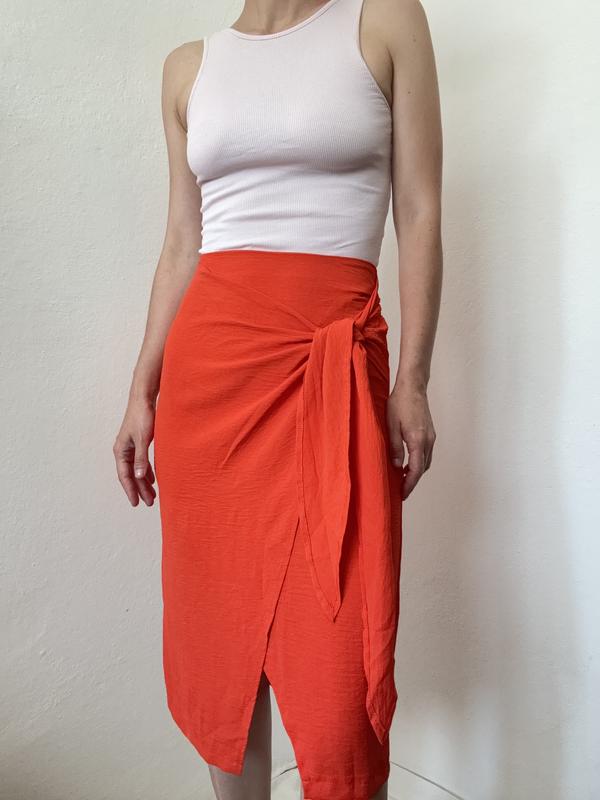 Яскрава спідниця на запАх Shein Легка, повітряна тканина, приємна до тіла. Розмір вказано Xs, підійде і на S Заміри: півобхват талії-34 см (тягнеться до 37 см), півобхват бедер орієнтовно 47 см (тягнеться до 50 см), довжина-70 см Одягнуто на розмір S, 173 см