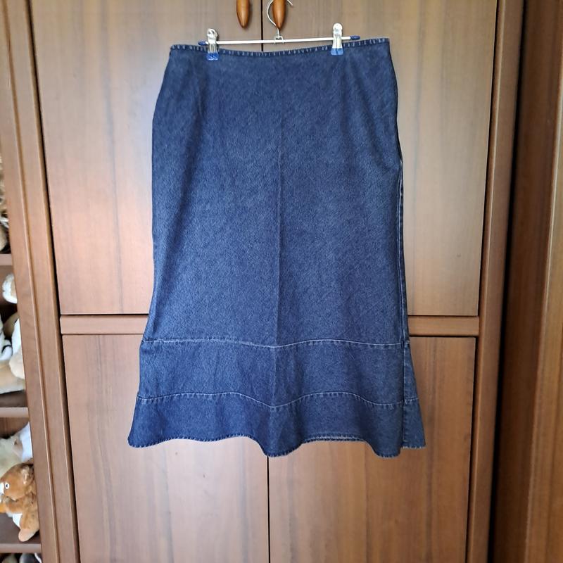Джинсовая юбка классического темно- синего цвета. Крой " по косой", поэтому очень комфортно в ежедневном использовании. Состав 100%натуральный. Украшена широким воланом и декоративной строчкой.