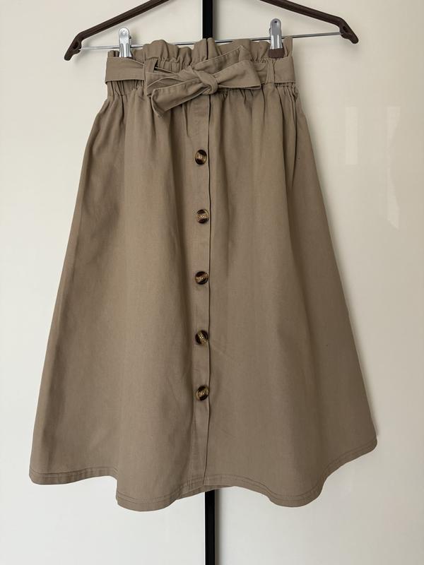 Коттоновая юбка миди в идеальном состоянии Имеет пояс в комплекте, пуговицы не рабочие Не одягала жодного разу Размер S Длина 67см Талия на резинке ПОТ до 40см Крой трапеция ПОБ 57см