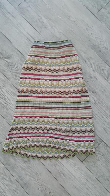 Просьба через кнопку КУПИТЬ оформлять после договоренности❤ Трикотажная вязаная юбка миди из вискоза и хлопка Marc Cain в стиле Missoni. Яркая расцветка. Юбка двойная, внутри подкладка. Модель буквой А, сверху на резинке, к низу расширена. Кружевной Подол, ажурная вязка. Очень стильно смотрится. Размер указан 2, на М-С
