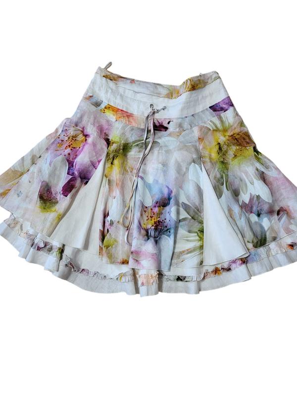 Спідниця 100% льон, бренду LisA CAMPIONE, дуже цікавого пошиття зверху кокетка, знизу вставки з білих клинів. Спідниця на підкладці до нижньої частини якої пришита оборка. Дуже симпатичного кольору. Спідниця великого розміру, збоку на змійці, ПОТ 48,5, на кокетці трохи розійшлася нитка на останньому фото видно