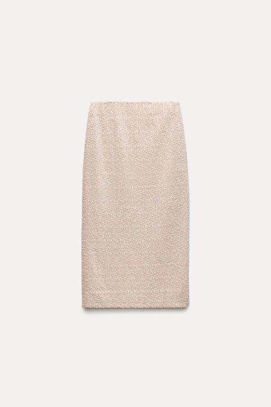 ZARA WOMAN COLLECTION Юбка средней длины с подкладкой, с высокой посадкой, отделкой с блестками и бахромой по краям. Разрезы сзади внизу. Застегивается на скрытую молнию. Блестки добавляют утонченности этой юбке средней длины с аккуратными аппликациями небольших размеров и различных форм. Облегающая юбка средней длины, которая полностью адаптируется к формам тела и легко сочетается с трикотажным нарядом и топами в белье. Уменьшает Беж