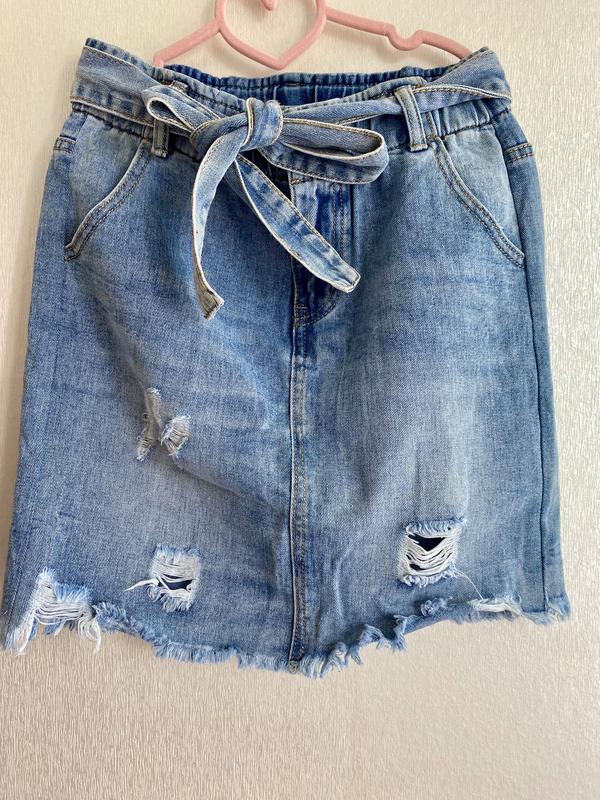Джинсовая юбка с поясом на резинке за завязкой в размере S. Внешняя эмитация карманов. Спереди есть карманы. Рваний низ. Одягалась 1 раз.