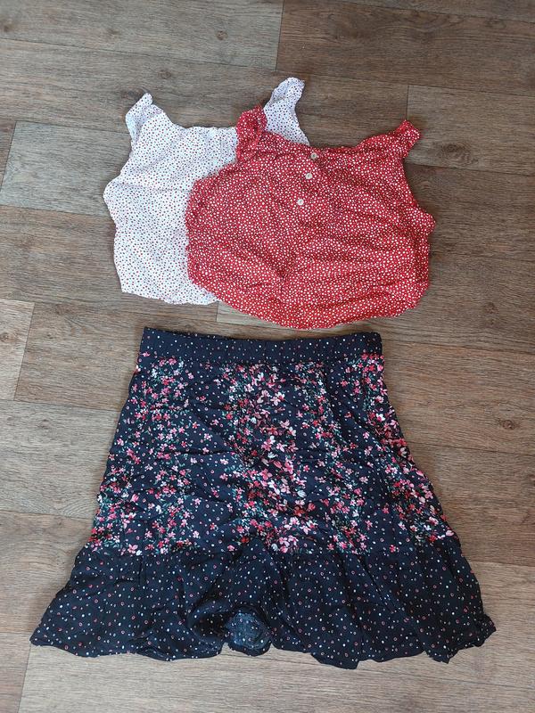 всім лотом спідниця та майки, без дефектів, не встигла погладити, спідниця м але більшемірить на л натовпу л