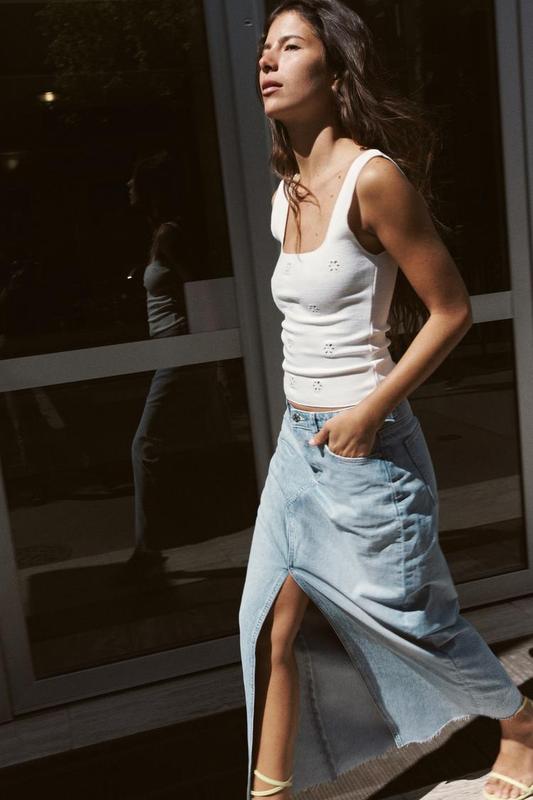 Юбка с высокой талией и пятью карманами. Зниклий ефект. Передний разрез и бесшовная отделка. Спереди застежка на молнию и металлические кнопки. Прекрасный вариант на осень. Средне-синий ОВНЕШНЯЯ ОБЛОПКА 100% бавовна