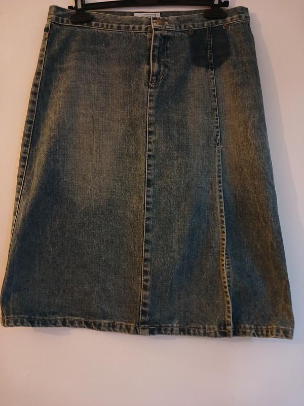 джинсова юбка з розрізом на нозі напівоб'єм: талія - 43 см стегна - 53 см довжина 67 см розріз 38 см джинс плотний, ледве тягнеться