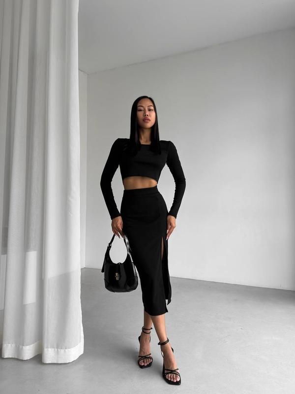 Женский комплект кроп-топ и юбка-миди с разрезом в черном цвете