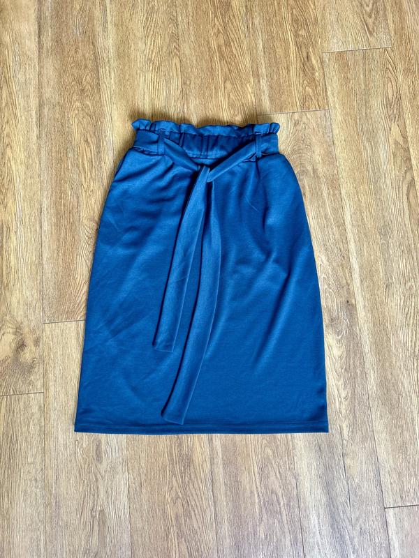 Юбка синего цвета, по бокам карманы, ткань стрейч. Пояс на резинке, обхват талии 80 см, длина изделия 62 см, обхват бедер 96 см. Юбка новая, не раз не одевалась.