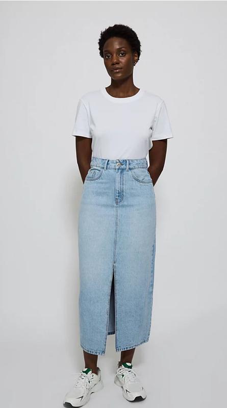Светлая джинсовая юбка миди George с разрезом по центру как у Зара! Шикарная, качество отличное, очень удачная длина!!️Новая, с брицами! Описание товара • Шлевка на талии • Застежка на кнопки и молнию • 3 передних кармана • 2 задних кармана • Передняя разрезная деталь • Крой длиной миди Склад тканини: 100% бавовна Замеры: Длина 93 см, ПОЯС полуобхват 41, Бедра полуобхват 54, длина по центру до разреза 49 см, если одевать ниже талии ( средней посадки), тогда бедра будут меньше где-то 53 см, можно носить как высокой, так и средней посадки!