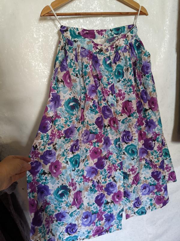 Очень красивая юбка миди винтаж, ткань вискоза не тянется, безумно красивая акварельная расцветка. Застёгивается спереди по длине на пуговицы обтянутые тканью, есть боковые кармашки, не особо глубокие. Модель очень женственная, эксклюзив в редком экземпляре. Состояние фактически новой вещи без дефектов! СОриентируйтесь пожалуйста на замеры указанные ниже. ПоТ- 35,5см ПоБ- 57,5см Длина- 83см Ширина пояса- 3,4см