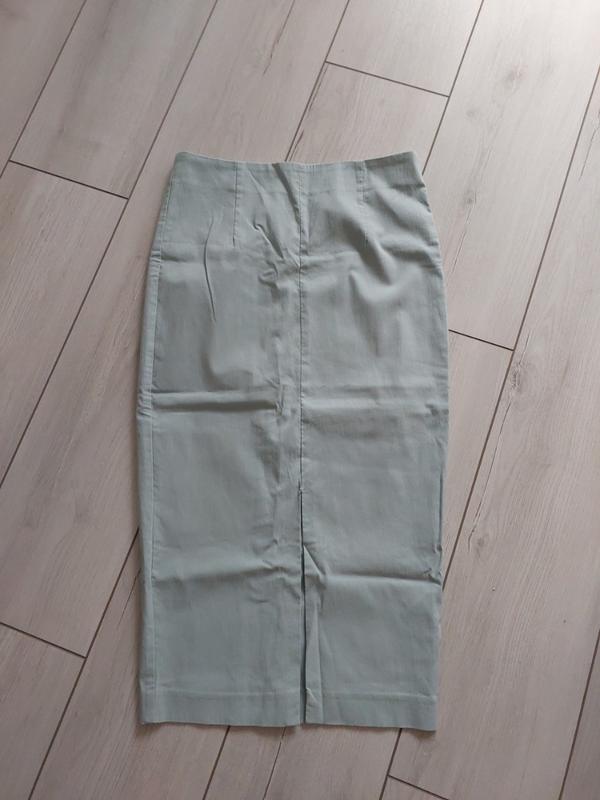 Юбка карандаш, мятного цвета, красиво тянется, с недостатков следует прошить у распорки, сзади есть молния, размер на бирке 38. Замеры Длина изделия 74см. Талия 36см, тянется до 40см. Бедра 42см,тягнеться до 51см.