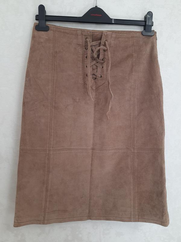 Отличная плотная замшевая юбка. Спереди декоративная шнуровка, сбоку застегивается на молнию. Замеры: ПП 39 ПС 50 Низ 54 Длина 63