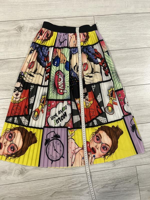 Тонкая ткань,в складки, не требует глажки, быстро высыхает, не кашлатится, на резинке, которая хорошо тянется, стильный принт, который легко комбинировать с другой одеждой (от кроссовок к каблукам).Без бирки