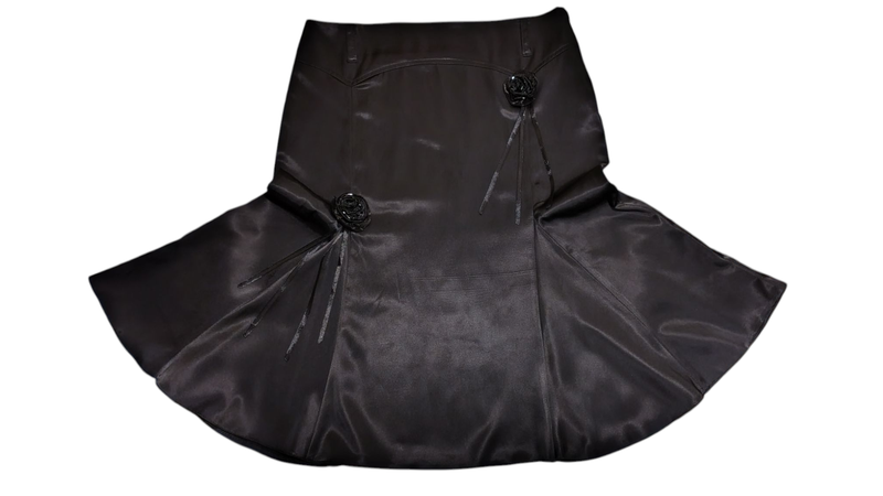 Спідниця чорна з атласу, на кокетці, добре лягає по фігурі Прикрашена квітками з бісером зі стрічками. По низу волани, красиво розлітається при ходьбі. Має приховану блискавку з боку Є ньюанс, див. останнє фото, котяча подряпина 4 см біля бокового шва, близько до кокетки, під сорочкою зверху буде не видно Розмір M-L Заміри: Напівобхват талії 39 см Напівобхват по стегнам 48 см Окружність по низу спідниці 238 см Довжина 62,5 см