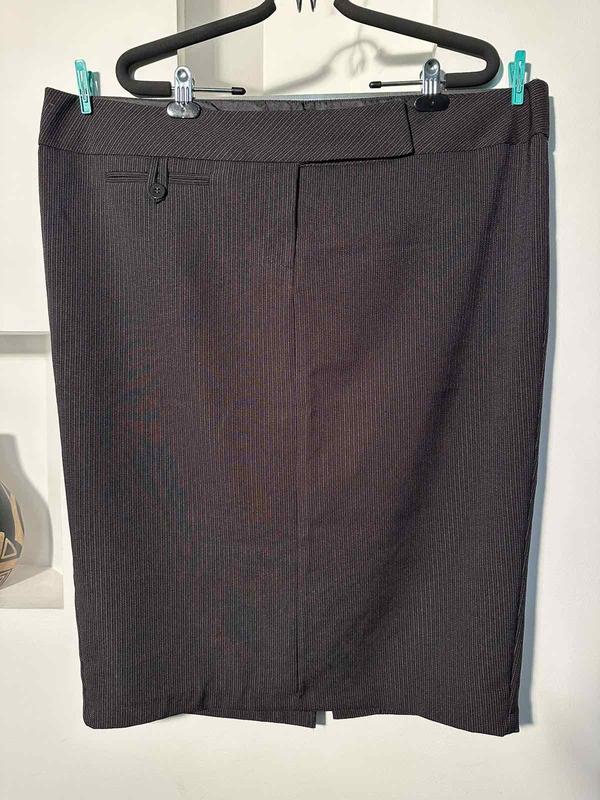 Состояние идеальное Темного цвета красивый строгий рисунок Крой - карандаш к низу приуженная На подкладке Ткань тянется Застегивается на пуговицу молнию и два крючка Сзади разрез 26 см Смотрится супер Бирка с размером и составом срезана Ориентируйтесь по замерам Замеры Пот 57 Поб60/65 Длина 71