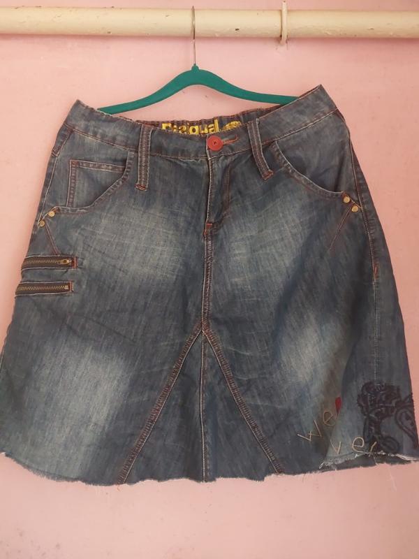 Юбка из джинсовой ткани синего цвета, фасон трапеция, с боковыми карманами, с одной стороны украшена металлическими молниями, с другой стороны внизу вышивка, не подрублена, пояс сзади на резинке, сзади накладные карманы, на одной вышита фирменная надпись, застегивается спереди на молнию и пуговицу. Бирка со складом ткани, размером отсутствует.
