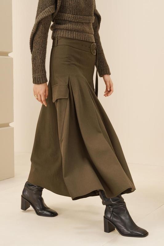 Цена 3650 Юбка миди из хлопка и лиоцелью. Средняя посадка и талия со шлевками. Регулируемый ремень из той же ткани с металлической пряжкой. Боковые накладные карманы с клапаном. Деталь складки. Низкая расклешенная линия. Боковая застежка на потайную молнию в шве. Темный хаки | 9262/211