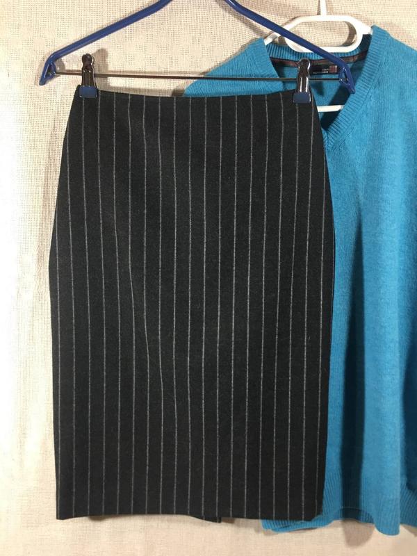 Тепленькая юбочка на подкладке Цвет очень темный серый в тоненькую белую полоску Силуэт по фигуре с открытой шлицей сзади Застежка на молнию Длина 62 см ПОТ 37 см ПОБ 47 см ПО низу 40 см