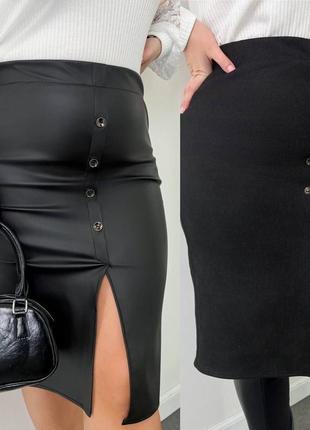 Спідниця 790 грн 😍 #1432 Розміри 48-52,54-58,60-64 Тканина шкірзам та замш на дайвінгу дуже гарна якість 👍 Заміри 👇 48-52. 54-58. 60-64 Об👉110. 120. 130 Довжина 63. 66. 69 Тканина тягнеться до 10 см👌 Висока зручна посадка, талія на резинці, ззаду два кармани Спереду ґудзики для декору, розріз 20 см