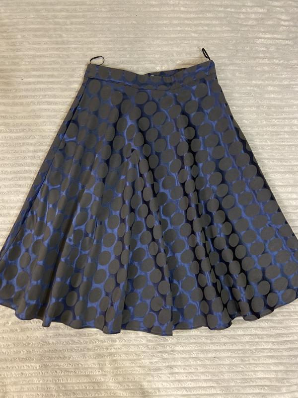 Юбка клеш (полусолнце) с двумя карманами. Застегивается сбоку на молнию. Интересный цвет - сочетание матового и глянцевого синего. Интересно переливается на свету. Состояние отличное, одета один раз. Ширина по поясу 33см Длина 60см