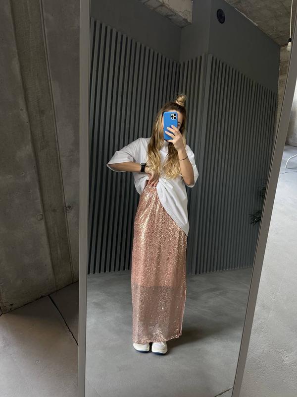 Спідниця Арт.0498 Тканина: паєтка+трикотажний підклад. Розмір:42-44,46-48 Колір:золото, чорний Спідниця міді, на резинці, збоку є розріз для зручності ходьби. Спідниця на підкладці, не колеться.