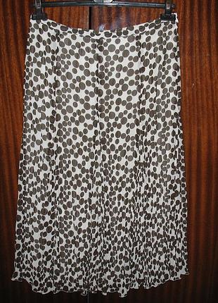 ЮБКА-МИДИ «BASLER» Состояние – идеальное. Цвет – белый в коричневый горох В нижней части – плиссе ПОТ – 40 см ПОБ – 51-52 см Застежка – с боку – молния + пуговичка на ленточке) На подкладке 100% полиэстер