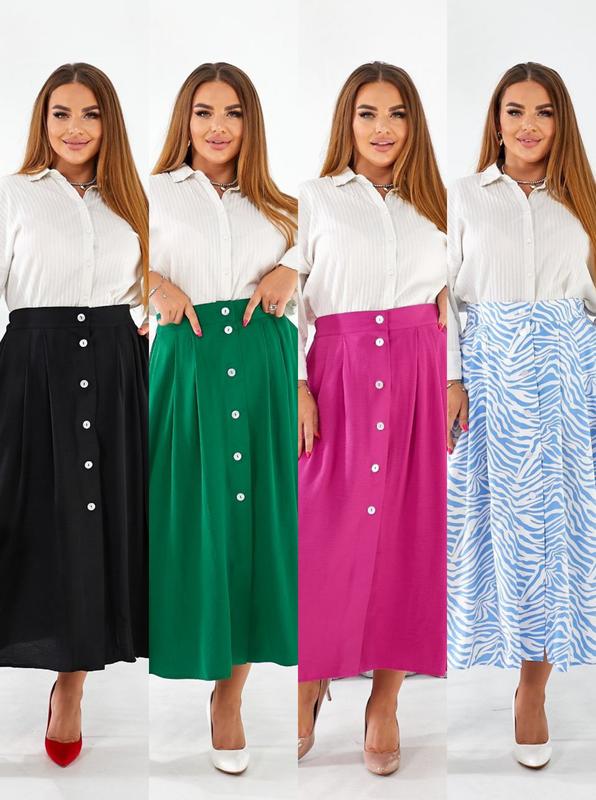 No263 юбка на пуговицы, по спинке резинка. Тканина; жатка ( американский креп)., софт ( прінт зебра) Цвет; трава, малина, черный (жатка). беж, голубой ( зебра). Р- р: 44,46,48,50,52,54. 44 (М) Об т - 72-74. Дл юбки 84 см. 46 ( Л) Об т -78-80. Дл юбки 84 см. 48 (ХЛ) Об т -82-84. Дл юбки 85 см. 50 (ХХЛ) Об т -86-88. Дл юбки 85 см. 52 ( ХХХЛ) Об т- 90-92. Дл юбки 85 см. 54 (ХХХЛ) Об т - 94-96. Дл юбки 87 см. По переду юбки пуговицы рабочие, по спинке резинка, карманы рабочие.