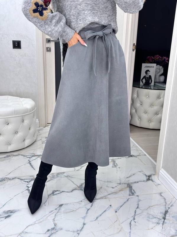 Юбка миди длинная серая солнце клеш с карманами с ремнем замшевая с поясом на поясе