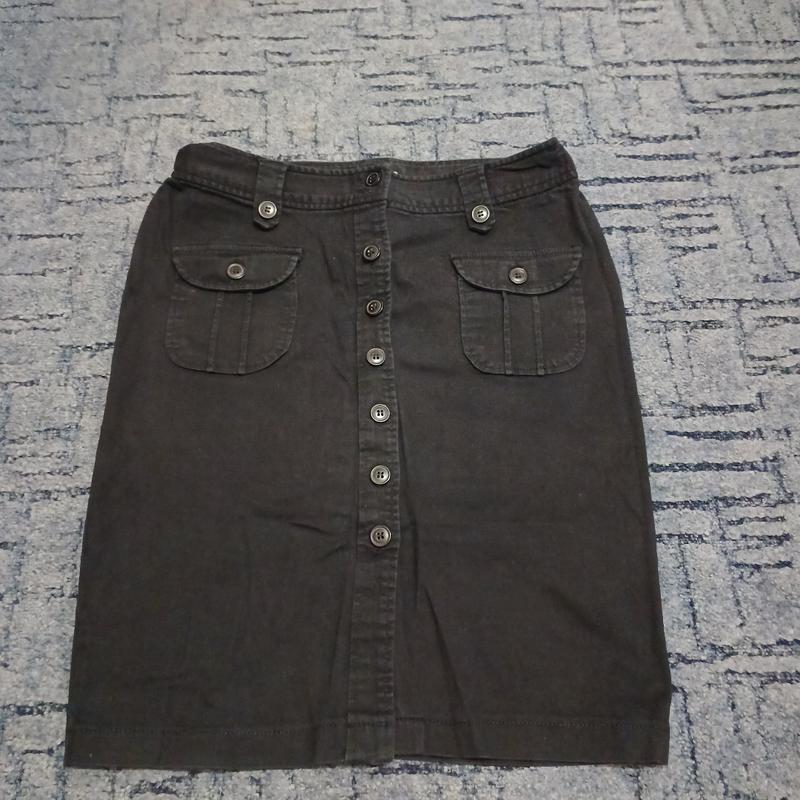 юбочка спереди на пуговицах есть карманы: спереди накладные, а сзади внутренние бирки нет, но ткань коттон размер 12, может быть, даже 14